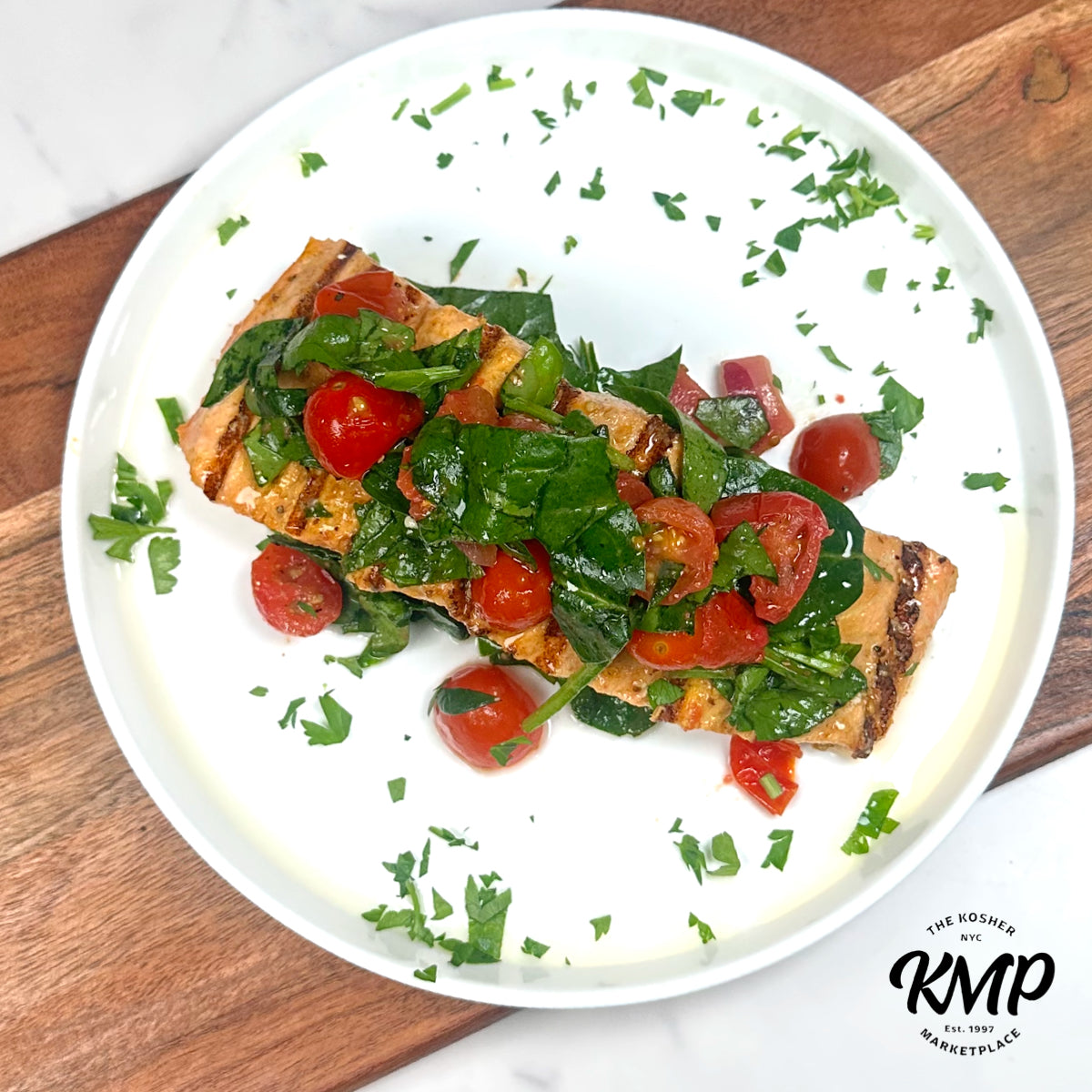 Sashimi Grade Ōra King Salmon, Baby Heirloom Tomatoes, Spinach, Red Onions, Lemon Juice, EVOO, Herbs & Spices, Sea Salt, Black Pepper